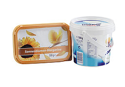 Insbesondere bei Lebensmittelverpackungen ist ein hochwertiges Druckbild erforderlich. Die Druckfarben dürfen dabei nicht auf das Lebensmittel übertragen werden und müssen sicher auf der Verpackung haften. Vor der Befüllung mit Lebensmitteln werden die bedruckten Becherschachteln (z.B. Joghurtbechern, Margarineschachteln) für den Transport ineinander geschachtelt. Dabei ist der Farbübertrag von einer bedruckten Außenseite zur nächsten nicht bedruckten Verpackungsinnenseite unbedingt zu vermeiden.