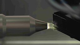 Aktuell setzt Plasmatreat eine Fertigungszelle mit den Außenabmessungen 1200x1200x2100mm (Breite × Tiefe × Höhe) für die Fahrzeugindustrie um, bei der verschiedene Steckerleisten behandelt werden. Diese Bauteile werden in Nutzfahrzeugen verbaut, beispielsweise in der Motor- oder Getriebesteuerung. Zur Herstellung dieser Steuereinheiten muss das Polyamid-Gehäuse der Steckerleiste vorbehandelt werden, damit später ein Silikondichtstoff dort anhaftet. Dazu wird die Kunststoffoberfläche mittels Openair-Plasma gereinigt und aktiviert. Hierfür wird eine Plasma-Rotationsdüse RD1004 eingesetzt, die kaltes Plasma erzeugt. Diese Plasmadüse eignet sich vor allem für thermisch empfindliche und geometrisch komplexe Oberflächen und Werkstoffe. Das patentierte Rotationsprinzip verteilt die Plasmawirkung gleichmäßig auf den zu behandelnden Materialien. Dabei wird die Oberfläche mehrmals kurzzeitig, pulsartig überstrichen, was eine sehr effektive Form der Reinigung und Aktivierung, bei gleichzeitig geringem Wärmeeintrag, darstellt.