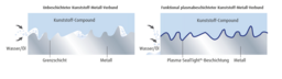 Im ersten Prozessschritt wird die Oberfläche des Metalls mit Openair-Plasma® feinst gereinigt. Unmittelbar danach wird die Metalloberfläche mit der haftvermittelnden und korrosionsschützenden plasmapolymeren Schicht versehen. Sowohl die Plasmareinigung als auch die Plasmabeschichtung erfolgen innerhalb weniger Sekunden und ortsselektiv, d. h. nur an zuvor definierter Stelle. An das beschichtete Metall wird im anschließenden Spritzgießprozess der Thermoplast gespritzt.