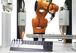 Due sistemi al plasma affiancati eseguono il trattamento al plasma. Nella prima fase il robot (o nelle versioni più piccole, un sistema ad assi XY) muove l’inserto in metallo al disotto di un ugello Openair-Plasma® , il quale provvede alla micro-pulizia della superficie a livello molecolare per l’eliminazione di ogni particella contaminante e creare le condizioni per una bagnabilità ottimale. Subito dopo la fase di pulizia, il secondo sistema plasma applica il rivestimento funzionale sull’inserto in metallo tramite il processo Plasma-SealTight® .